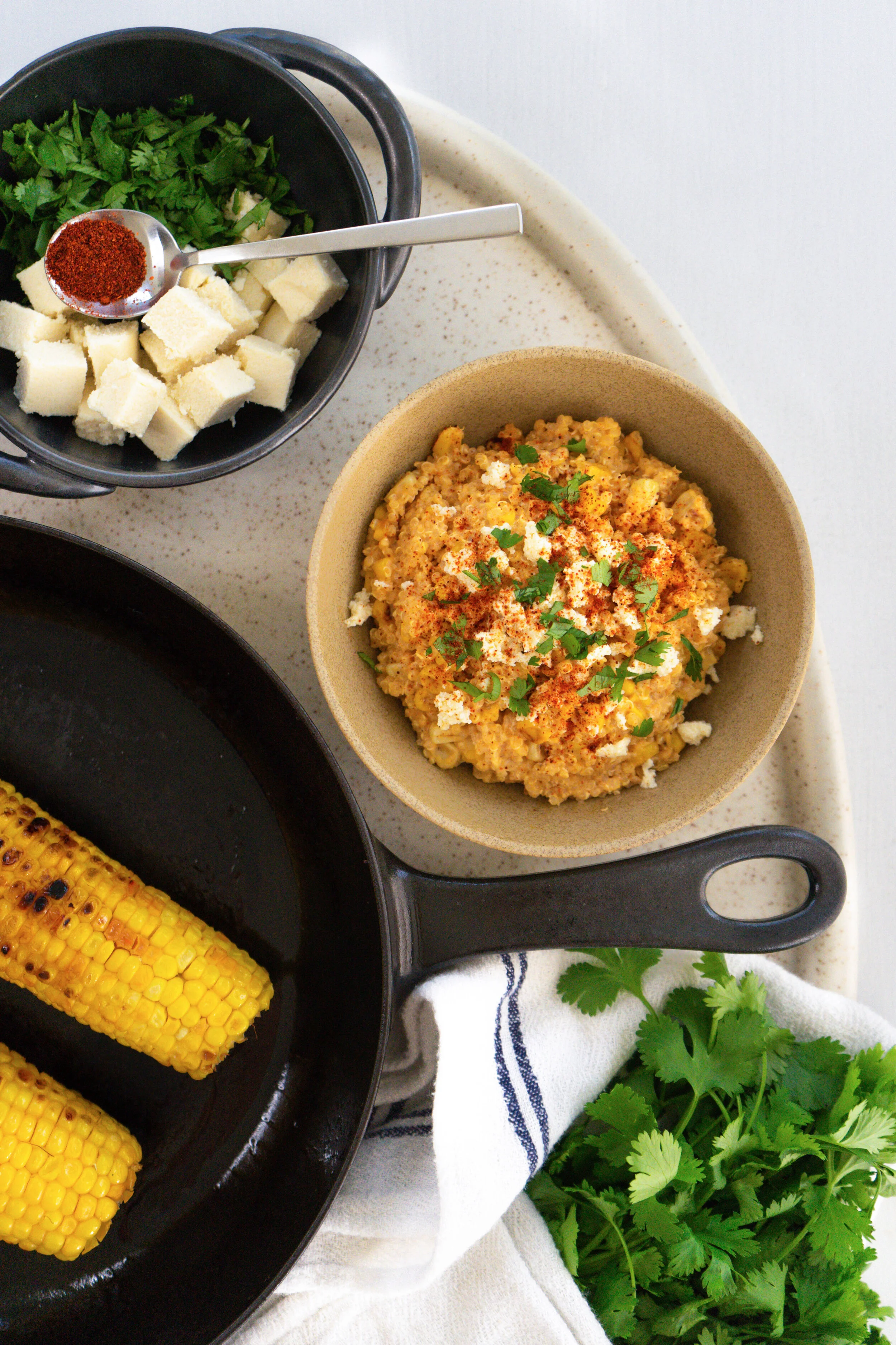 Elote, Mexican street corn, has always looked so enticing to me - grilled corn on the cob slathered with mayonnaise, lime, chili, cilantro, and Cotija cheese - but I haven’t been able to try it made by others because of the mayonnaise and cheese, so I’ve created my own interpretation in the form of a quinoa dish.